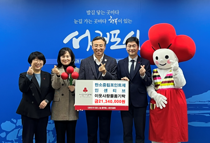 서귀포시는 지난 10일 지역 내 어려운 이웃을 위해 2023년도 하반기와 2024년도 상반기 탄소중립포인트제 인센티브 21,340천 원 상당의 상품권을 제주사회복지공동모금회에 지정 기탁하였다.