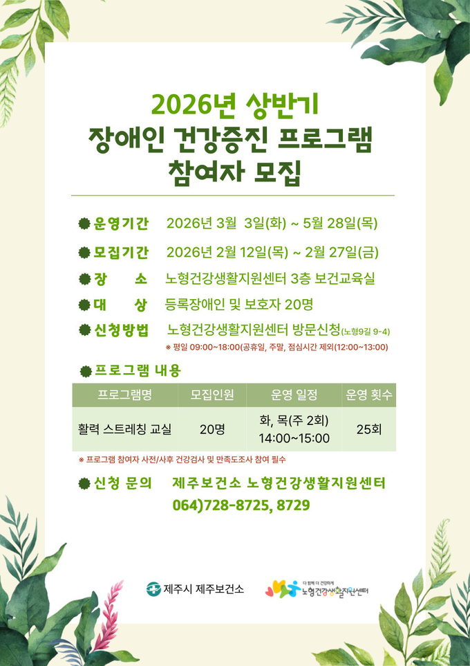 제주보건소 노형건강생활지원센터는 장애인 건강증진 프로그램 ‘활력 스트레칭 교실’을 3월부터 5월까지 운영한다.