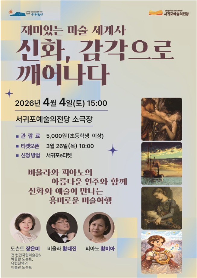 서귀포예술의전당 관계자는 “이번 특강을 통해 시민들이 멀게만 느껴졌던 고전 신화와 무심코 지나쳤던 지폐 속 그림에서 자신만의 예술적 가치를 발견하는 소중한 시간이 되길 바란다”라고 밝혔다.