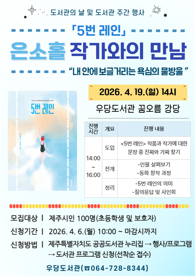 참가 신청은 4월 6일부터 4월 12일까지 제주특별자치도 공공도서관 누리집(https://www.jeju.go.kr/lib)을 통해 선착순으로 접수하면 된다.