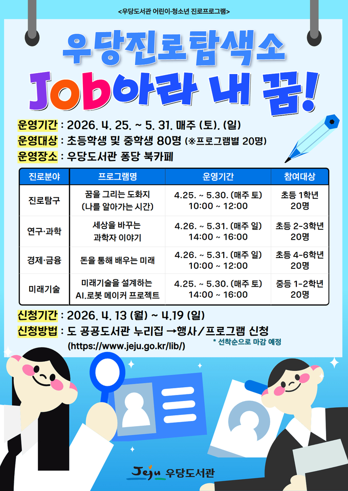 우당도서관은 어린이와 청소년이 다양한 직업 세계를 경험하며 미래를 설계할 수 있도록 돕기 위해 오는 4월 25일부터 5월 31일까지 ‘우당진로탐색소: Job아라 내 꿈!’ 프로그램을 운영한다.
