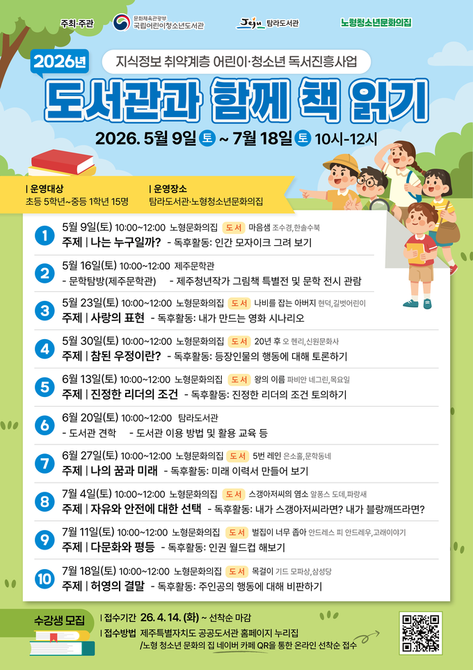 탐라도서관은 도서관 접근이 어려운 청소년을 대상으로 독서 흥미를 높이고 책 읽기를 생활화할 수 있는 환경을 제공하기 위해 ‘2026년 도서관과 함께 책 읽기’ 사업을 운영한다.