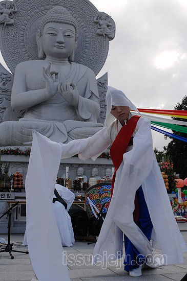 관음사 제주대불 앞에서 승무 공양이 이뤄지고 있다. |