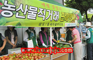 농협중앙회 서광로지점(지점장 강성근)과 제주시 삼도1동 새마을부녀회(회장 고복연)는 지난 6일 농협서광로지점 앞에서 농업·농촌사랑운동의 일환으로 자매결연마을인 애월읍 중엄리에서 생산한 수박 및 포도, 단호박, 토마토, 오이 등 우리농산물 직판행사를 열었다.
