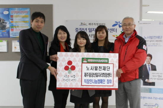 노사발전재단 제주중장년일자리희망센터(소장 강수영)는 12월 9일 제주사회복지공동모금회(회장 고승화)가 연중 진행하는 직장인나눔캠페인에 동참하고 전 직원이 매월 월급의 일부를 나누는데 동참했다.
