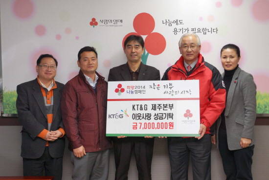 KT&G 제주본부(본부장 오영수)는 12월 20일 제주사회복지공동모금회(회장 고승화)를 방문해 도내 어려운 이웃을 위해 사용해 달라며 성금 700만원을 기탁했다.
