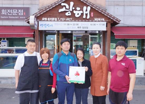 광해횟집(대표 차민혁)은 최근 제주사회복지공동모금회(회장 고승화)가 연중 진행하는 착한가게 캠페인에 동참하고 이웃사랑 실천에 나섰다.