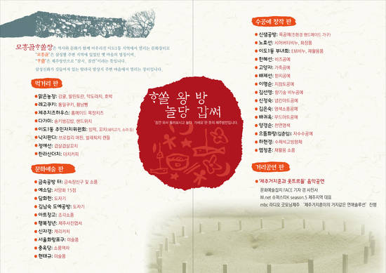 이번 행사에는 총 35개 팀이 참여하며 특히, “제주거지훈과 웃뜨르들”이 찬조 출연하여 음악 공연을 펼치면서 4시간(오전 11시~오후 3시) 동안 참여자들 상호 간의 소개를 통해 행사장을 방문하는 지역 주민들 및 방문객과 지속적인 소통을 추진할 계획이다.
