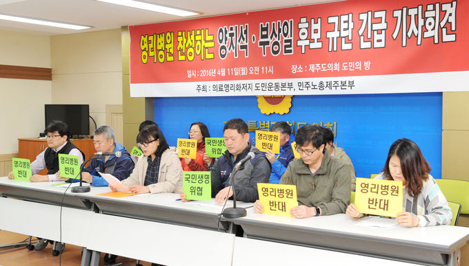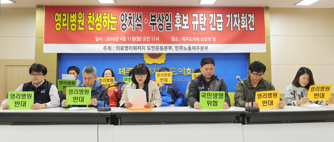 11일 오전 11시 제주도의회 도민의방에서 기자회견을 가진 이들은 "영리병원을 찬성하는 새누리당 양치석, 부상일 후보에게는 국회의원 후보 자격이 없다"고 전제한 후 "총선이 사흘 앞으로 다가왔다. 그런데 믿지 못할 일이 벌어지고 있다. 도민의 대표를 선출하는 국회의원 선거 기간 여론과 정반대 정책을 추진하겠다는 후보들이 있다"고 지적했다.