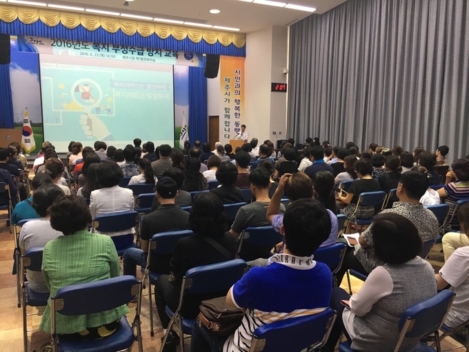 제주시는 6월 23일 오후 2시, 시청 제1별관회의실에서 관내 지역아동센터, 종합사회복지관, 어린이집 등 복지시설 관계자 및 복지담당 공무원 등 300명을 대상으로 보건복지부 신준호 담당관을 강사로 초청하여 2016 복지 부정수급 방지교육을 실시했다고 밝혔다.