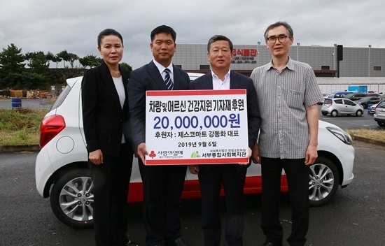 제스코마트 강동화 대표는 최근 제스코마트 본점에서 제주사회복지공동모금회(회장 김남식)를 통해 경승용차 1대와 어르신 건강지원을 위한 기자재 후원금을 서부종합사회복지관에 전달했다.