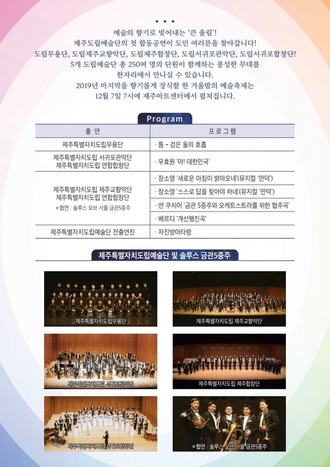 5개 도립예술단(도립무용단, 제주교향악단, 제주합창단, 서귀포관악단, 서귀포합창단) 250여 명의 단원이 예술의 향기로 빚어내는 ‘큰 울림’ 공연이 오는 12월 7일 오후 7시 제주아트센터에서 개최된다.