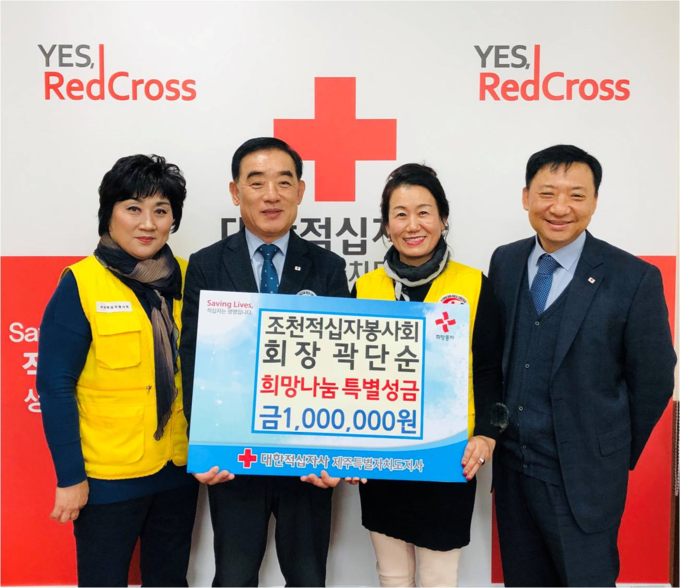 곽단순 조천적십자봉사회 회장은 11월 25일 적십자사 2층 회장실에서 대한적십자사제주특별자치도지사(회장 오홍식)에 희망나눔 특별성금 100만원을 전달했다.