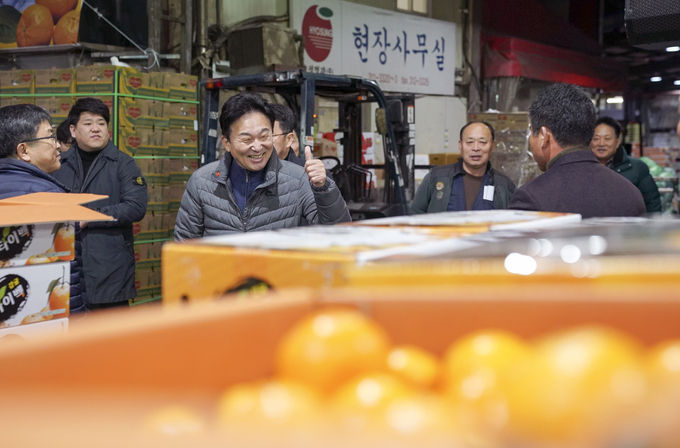 27일 새벽 감귤 홍보를 위해 대구 경매시장을 찾은 원희룡 지사, 이날 지역 포럼에 참석 정치적 입장을 드러내기도 했다
