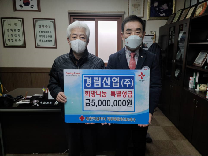 경림산업(주)(대표 김기형) 1월 22일 경림산업(주) 사장실에서 대한적십자사제주특별자치도지사(회장 오홍식)에 소외된 이웃을 돕기 위한 희망나눔 특별성금 500만원을 전달했다.