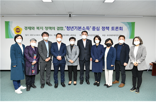 제주특별자치도의회 의원연구단체 우리제주복지연구회(대표 김대진 의원, 더불어민주당, 동홍동)은 4월 14일(수) 오전 10시 제주특별자치도의회 소회의실에서 경제와 복지정책의 결합으로서 ‘청년기본소득’ 중심 정책토론회를 개최했다.