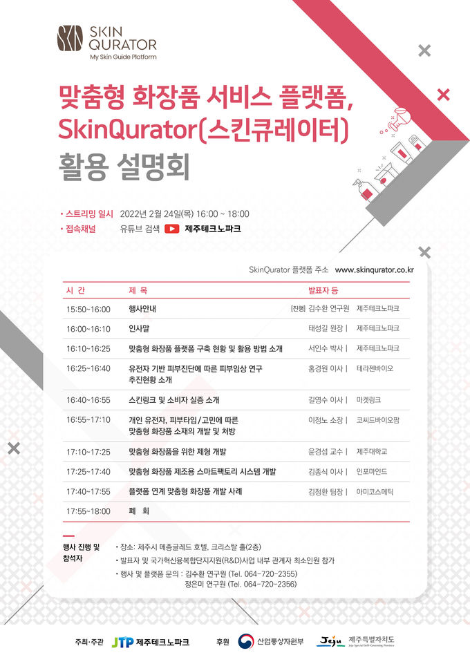 제주테크노파크(원장 태성길, JTP)는 오는 24일 오후 4시‘맞춤형 화장품 서비스 플랫폼 활용 설명회’를 개최한다.