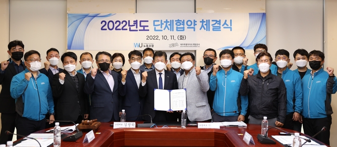 제주특별자치도개발공사(사장 김정학)와 제주특별자치도개발공사노동조합(위원장 허준석)은 제주시 첨단과학단지 내 임시사무동에서 공사 창립 이래 두 번째 단체협약 체결식을 지난 11일 가졌다.