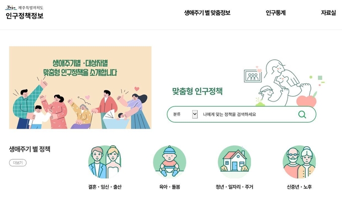 이중환 제주도 기획조정실장은 “생애주기별 인구정책 포털 서비스를 통해 인구정책 정보에 대한 도민 접근성을 높이고 각종 지원사업이 효과적으로 홍보되기를 기대한다”고 말했다.