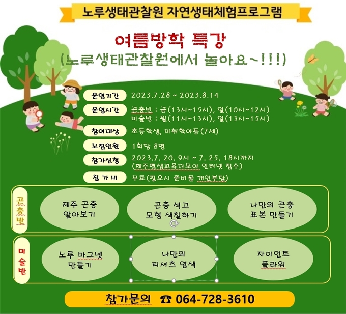 참여 희망 초등학생은 제주평생교육다모아(https/damoa.jeju.kr) 시스템을 통해 7월 20일부터 25일까지 선착순으로 1회당 8명까지 모집한다.