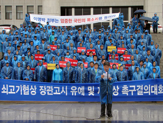 13일 오전9시30분 국회 본청 앞에서 미국 쇠고기협상 장관고시 유예와 재협상 촉구 결의대회가 열리고 있다. |