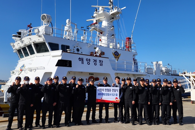제주해양경찰서 521함(함장 김문철)은 12월 13일 제주항7부두에서 이웃사랑 실천을 위해 직원들이 십시일반 모은 헌혈증서 20매를 대한적십자사 제주특별자치도혈액원(원장 김영섭)에 전달했다.