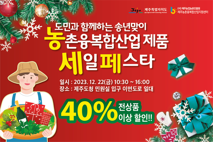 제주특별자치도는 ‘도민과 함께하는 송년맞이 농촌융복합산업 제품 세일 페스타’를 22일 제주도청 민원실 입구 이면도로에서 개최한다.