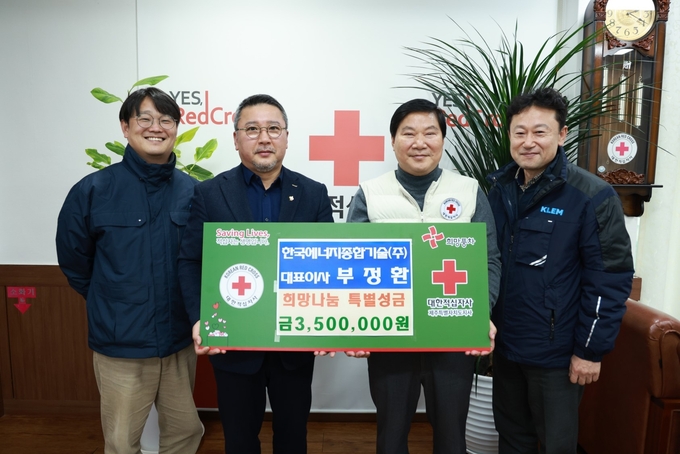 한국에너지종합기술(주)(대표이사 부정환)은 지난 1월 24일 대한적십자사제주특별자치도지사(회장 정태근) 회장실에서 지역사회의 소외된 이웃을 위한 희망나눔특별성금 350만원을 전달했다.
