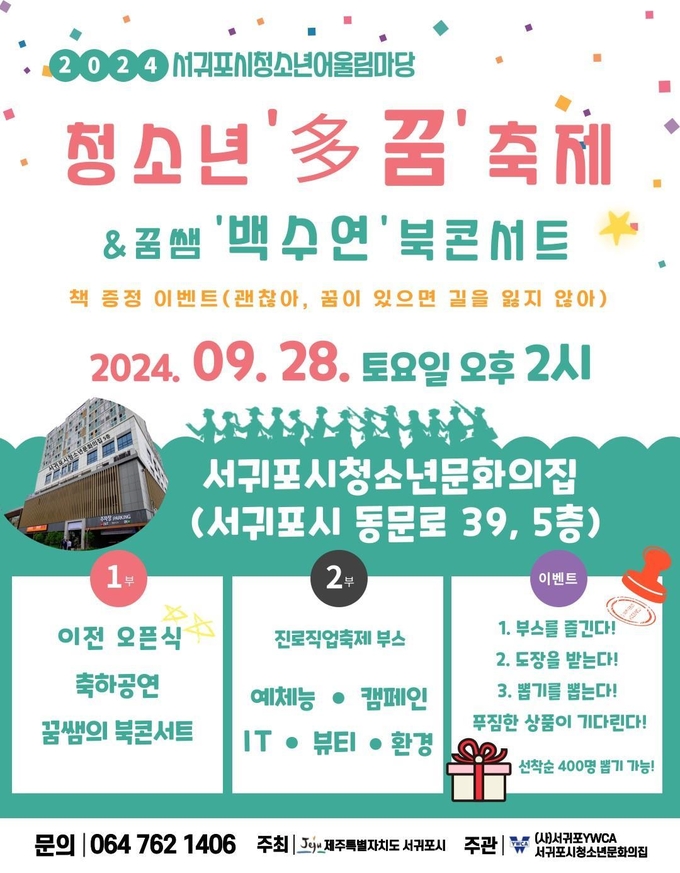 서귀포시(시장 오순문)와 (사)서귀포YWCA(회장 김정미)에서는 청소년어울림마당 진로·직업 체험의 장을 마련하고자 청소년‘多, 꿈’축제를 오는 9월 28일 새롭게 문을 연 서귀포시청소년문화의집에서 개최한다고 밝혔다.