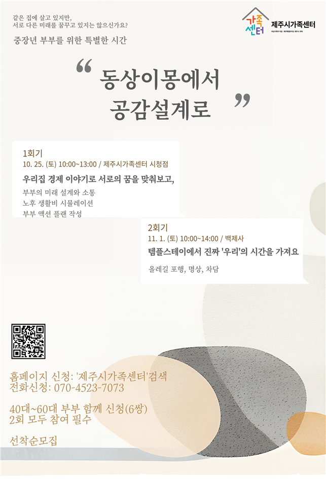 참여를 원하는 부부는 오는 10월 24일까지 제주시가족센터 누리집(http://jeju.familynet.or.kr) 또는 전화(☎070-4523-7073)로 신청하면 된다.
