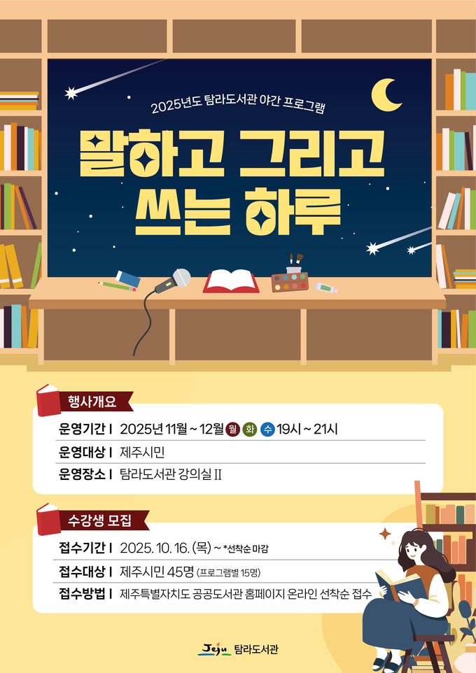 김봉석 탐라도서관장은 “이번 야간 프로그램이 바쁜 일상 속에서도 시민들이 다양한 문화활동을 즐길 수 있는 기회가 되길 바란다”고 밝혔다.