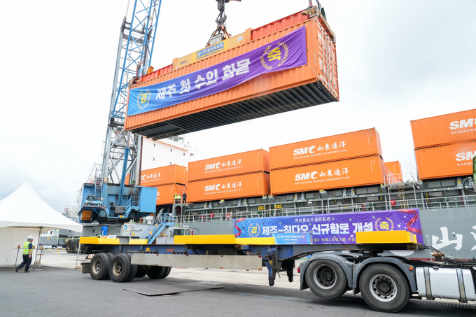 첫 입항 선박 ‘SMC 르자오’호에는 페트칩, 기계장비 등 약 40TEU의 수입 화물이 실렸으며, 제주에서는 수산물 가공품, 삼다수 등 10TEU 규모의 제품이 중국으로 수출된다.