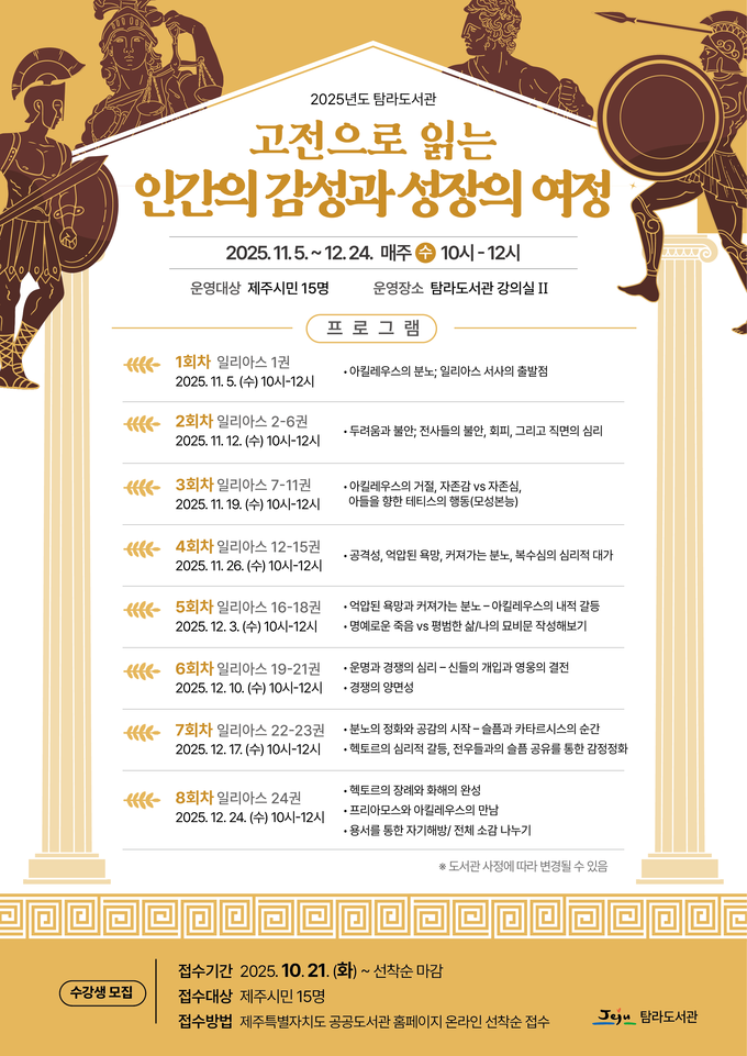 탐라도서관은 고대 그리스 서사시 ‘일리아스’를 활용한 ‘고전으로 읽는 인간의 감성과 성장의 여정’ 프로그램 참여자를 모집한다.
