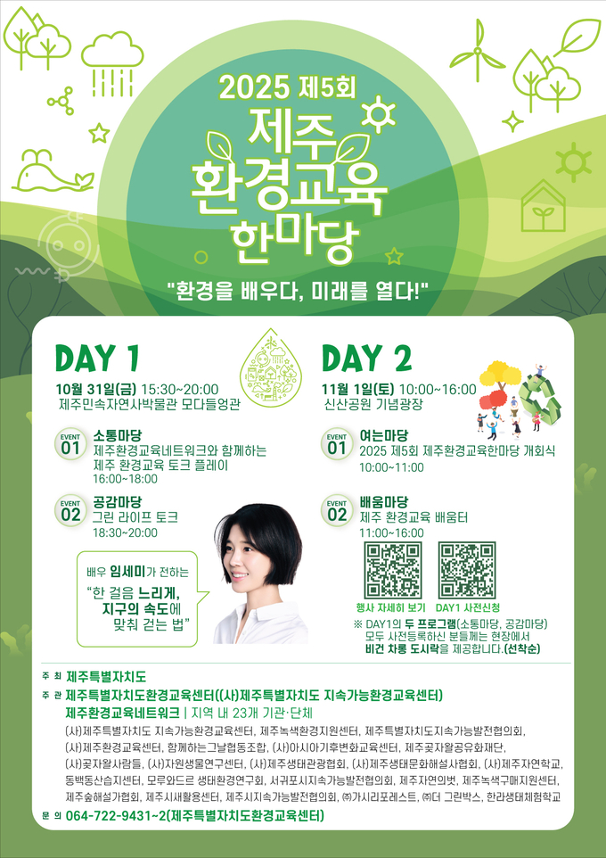 첫째 날인 10월 31일에는 ‘소통마당(환경교육 토크 플레이)’에서 다양한 환경교육 사례와 성과가 공유되고, ‘공감마당(그린 라이프 토크)’에서는 배우 임세미 씨가 ‘한 걸음 느리게, 지구의 속도를 맞춰 걷는 법’을 주제로 특별 강연과 대담을 진행한다.