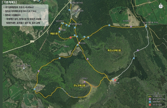 이번 사업은 궷물오름-족은노꼬메오름-큰노꼬메오름을 잇는 9.43km 구간을 국가생태탐방로로 정비해 2026년까지 마무리할 계획이다.