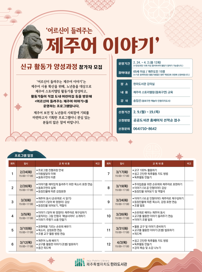 참가자들은 2월부터 3월까지 총 12회에 걸쳐 △동화구연 기법 △손유희 △제주어 그림책 재구성하기 등의 전문 교육을 받는다.