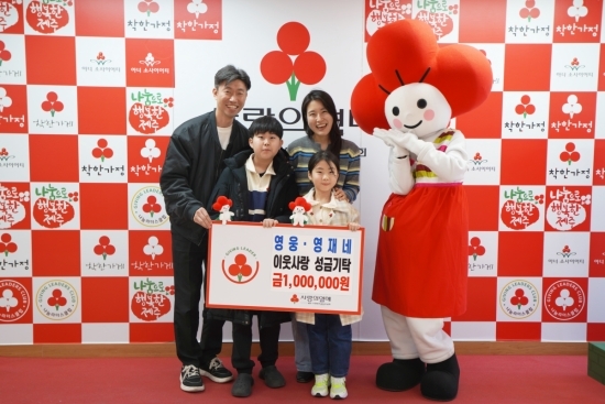 영웅·영재네 가족은 최근 제주사회복지공동모금회(회장 강지언·이하 제주사랑의열매)를 방문해 도내 어려운 이웃을 위해 사용해 달라며 성금 100만원을 기탁했다.