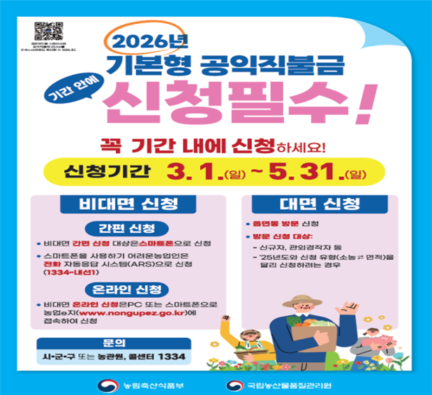 제주시는 농업·농촌의 공익기능 증진과 농업인 소득 안정망 강화를 위해 2026년도 기본형 공익직불금 신청을 3월 1일부터 5월 31일까지 접수한다.