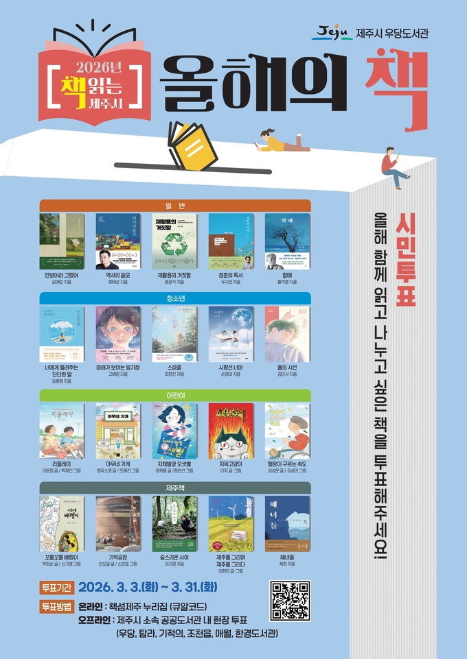 우당도서관은 ‘2026년 책 읽는 제주시 올해의 책’ 선정을 위한 시민투표를 오는 3월 3일(화)부터 3월 31일(화)까지 실시한다.