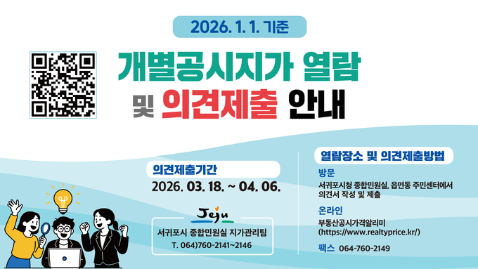 서귀포시는 2026년 1월 1일 기준 개별공시지가 산정을 완료하고, 3월 18일부터 4월 6일까지 개별공시지가 열람 및 의견 제출 기간을 운영한다고 밝혔다.