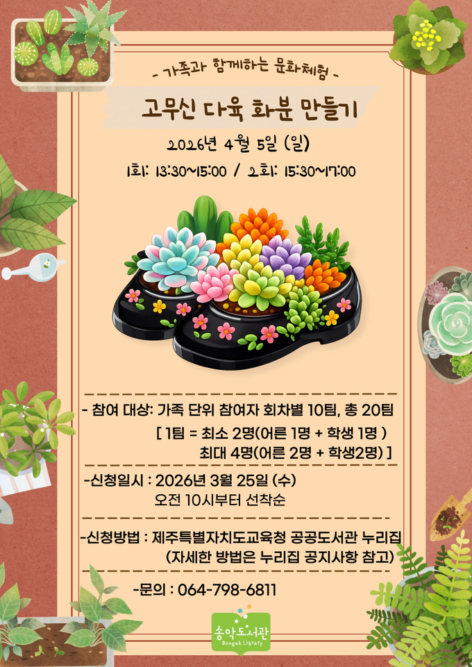 송악도서관(분관장 고도현)은 내달 5일 식목일을 맞아 가족 구성원 20팀을 대상으로 가족 문화체험 프로그램‘고무신 다육 화분 만들기’를 운영한다.