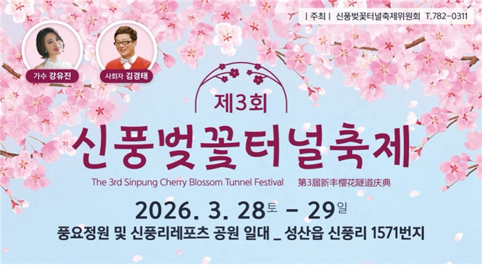 몸과 마음이 가벼워지는 따스한 봄, 가족・연인・친구 간의 잊지 못할 추억을 선사할 제3회 신풍벚꽃터널축제가 28~29일 양일간 성산읍 풍요정원 및 신풍리레포츠 공원 일원에서 개최된다.
