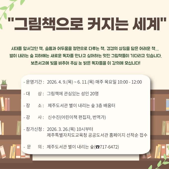 제주도서관(관장 강동선)은 내달 9일부터 6월 11일까지 자료실 보존서고에 소장된 그림책을 재조명하고 지역주민에게 깊이 있는 독서 경험을 제공하기 위해‘그림책으로 커지는 세계’참가자를 모집한다.