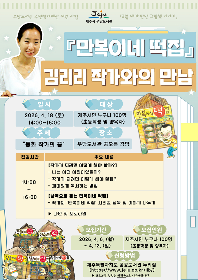 우당도서관은 ‘책보고’ 도서대출서비스 연계 사업의 일환으로 오는 4월 18일(토) 오후 2시 꿈오름 강당에서 김리리 작가 초청 강연을 개최한다.