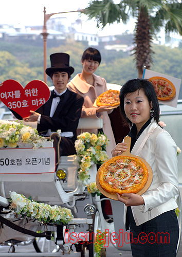 한편, 미스터피자는 350호 점인 ‘서귀포점’의 오픈을 기념해 이날 천지연폭포 앞 광장에서 여성고객들에게 턱시도를 차려 입은 멋있는 남성이 모는 마차에 탑승해 미스터피자의 신제품 ‘게살몽땅’피자를 즐기는 ‘여자를 위한 350호 마차’이벤트를 진행했다.