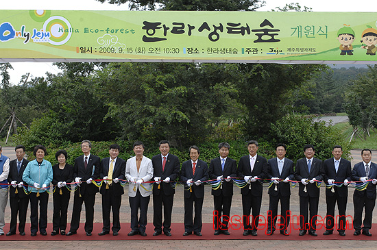 주요인사들이 한라생태숲 개장을 알리는 테이프를 자르고 있다. |