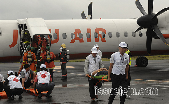 화재 진압 환료 후 공항공사와 제주소방서 구조요원들이 항공기 출입문을 여는 작업을 벌이고 있다. ⓒ 김영하 기자 |