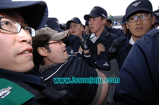 경찰에 집회 해산에 저항하는 해군기지 반대대책위와 위미리 주민들 ⓒ 김영하 기자 |