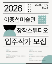 서귀포공립미술관은 창작 공간을 활성화하고 지역문화예술발전에 기여할 역량 있는 신진 미술작가를 발굴하기 위하여 2026년 이중섭미술관 창작스튜디오 입주작가를 2025년 11월 10일부터 11월 28일까지 공개 모집한다고 밝혔다. 모집분야는 회화분야(서양화, 동양화, 판화)이며, 서류심사와 포트폴리오 심사를 통해 총 3명의 작가를 선발한다. 심사는 예술성과 발전 가능성 등을 종합적으로 평가한다. 선정된 작가들에게는 입주기간 2026년 2월 2일부터 11월 27일까지 약 10개월간 창작활동에 필요한 작업공간이 지원되며, 입주기간 동안의 창작 결과물은 2026년 10월 중 결과보고전을 통해 대중들에게 선보일 예정이다. 2026년 이중섭미술관 창작스튜디오 입주작가 지원에 대한 자세한 정보는 서귀포시(https://seogwipo.go.kr) 또는 이중섭미술관 홈페이지(https://culture.seogwipo.go.kr/jslee) 에서 확인할 수 있다. 현봉윤 서귀포공립미술관장은 “창작스튜디오 입주 프로그램을 통해 차세대 예술인들이 자유롭게 창작활동을 펼칠 수 있는 기회를 제공하고 우리 시가 문화예술의 중심지로 성장할 수 있도록 지속적으로 노력하겠다”라고 밝혔다.