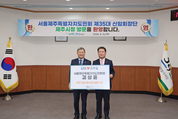 김상윤 제35대 서울제주특별자치도민회장은 지난 16일 제주시청을 방문해 고향사랑기부금 500만 원을 기탁했다. 이날 기탁식은 김완근 제주시장과 서울제주특별자치도민회 회장단이 함께한 가운데 진행됐으며, 고향에 대한 따뜻한 마음과 애정을 나누는 뜻깊은 자리로 마련됐다. 김상윤 회장은 전 재경구좌읍민회장으로 활동했으며, 2025년 4월 27일 임기를 마친 뒤 올해 4월 1일 제35대 서울제주특별자치도민회장으로 취임했다. 김상윤 회장은 “제주인으로서 고향 발전에 힘을 보탤 수 있어 기쁘다”며, “앞으로도 멀리서나마 고향 제주를 위한 사랑을 적극 실천하겠다”고 말했다. 김완근 제주시장은 “고향에 대한 깊은 애정과 소중한 나눔에 진심으로 감사드린다”며, “앞으로도 지속적인 관심과 응원을 부탁드린다”고 화답했다.